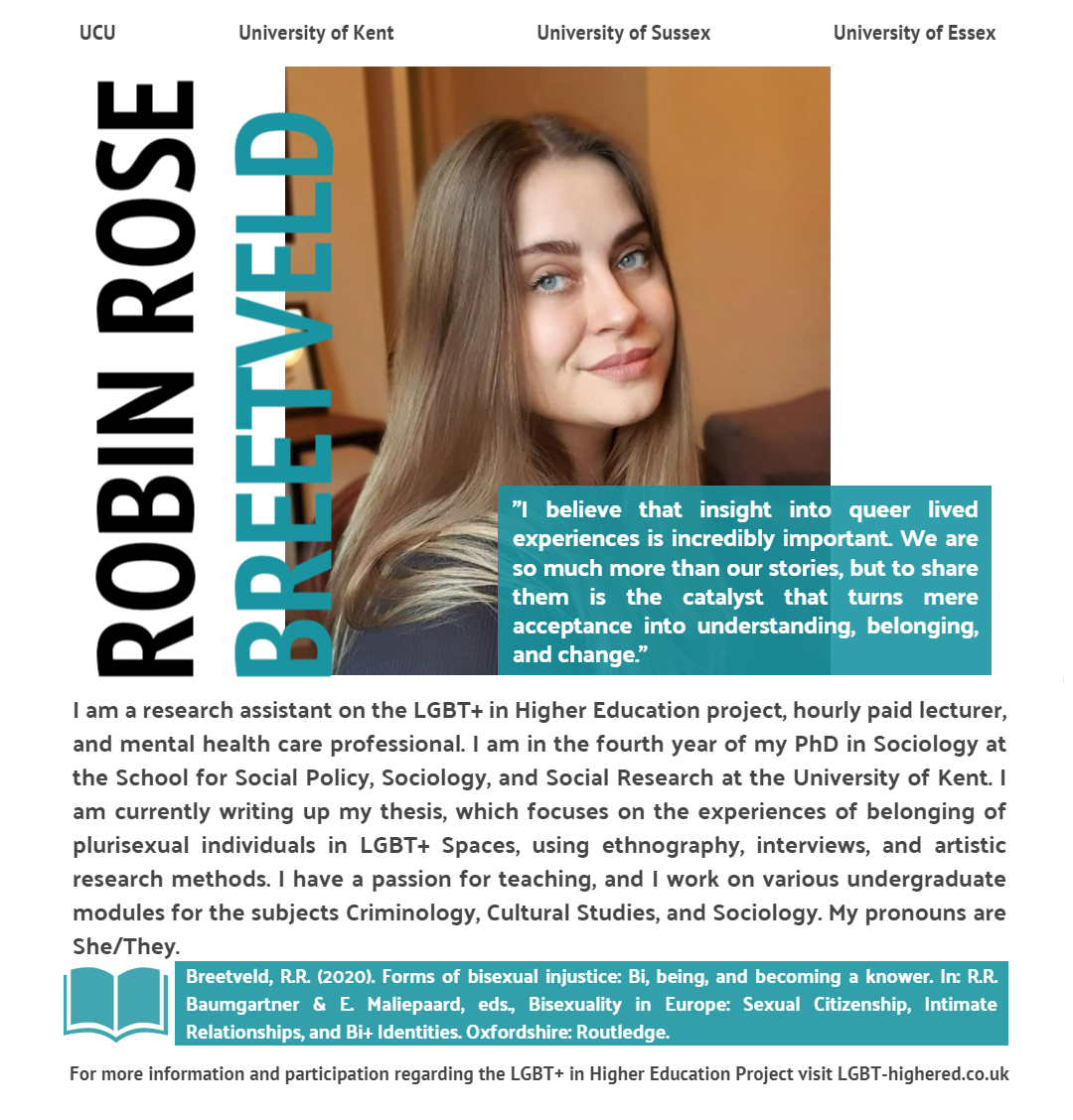 Robin Rose Breetveld is one of our three research assistants. They work on the qualitative side of the LGBT+ in HE project, and they manage our online presence. You can find Robin Rose on our website and on social media.